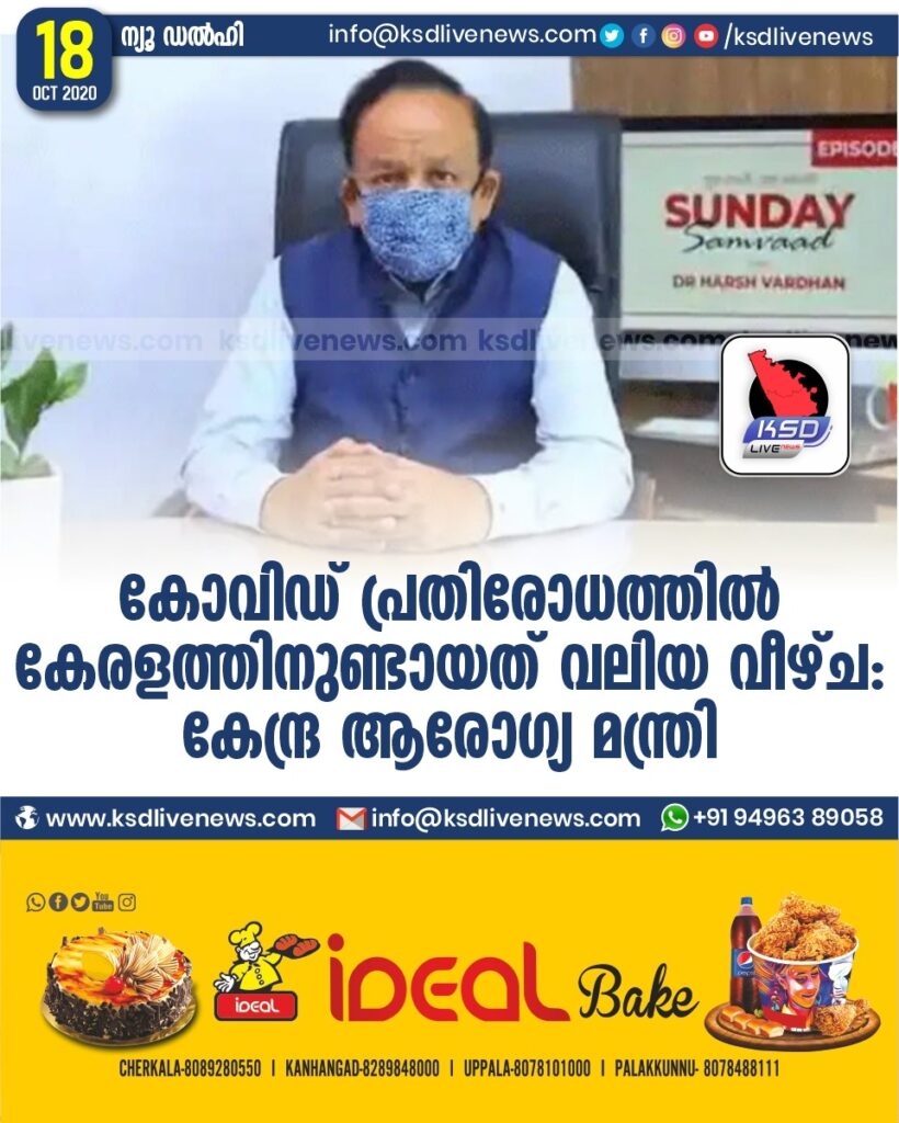 ന്യൂഡല്‍ഹി | കൊവിഡ് പ്രതിരോധത്തില്‍ കേരളത്തിന് വലിയ വീഴ്ച സംഭവിച്ചതായി കേന്ദ്ര ആരോഗ്യ വകുപ്പു മന്ത്രി ഡോ. ഹര്‍ഷവര്‍ധന്‍. അതിന്റെ വിലയാണ് സംസ്ഥാനം ഇപ്പോള്‍ നല്‍കിക്കൊണ്ടിരിക്കുന്നതെന്ന് സണ്‍ഡേ സംവാദ് പരിപാടിയില്‍ അദ്ദേഹം പറഞ്ഞു. ആദ്യഘട്ടത്തില്‍ രോഗ വ്യാപനം നിയന്ത്രിച്ചു നിര്‍ത്തിയിരുന്ന കേരളത്തില്‍ പിന്നീട് സമ്ബര്‍ക്ക ബാധിതരുടെ എണ്ണം ക്രമാതീതമായി ഉയരുന്ന സ്ഥിതിയാണുണ്ടായത്.