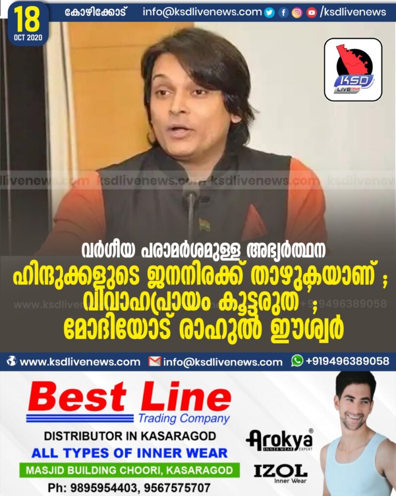 ഹിന്ദുക്കളുടെ ജനനിരക്ക് താഴുകയാണ് ; വിവാഹപ്രായം കൂട്ടരുത് ‘ ; മോദിയോട് രാഹുൽ ഈശ്വർ