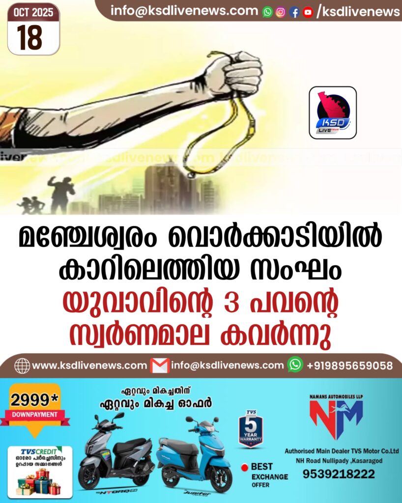 മഞ്ചേശ്വരം വൊർക്കാടിയിൽ കാറിലെത്തിയ സംഘം യുവാവിന്റെ 3 പവന്റെ സ്വര്ണമാല കവര്ന്നു