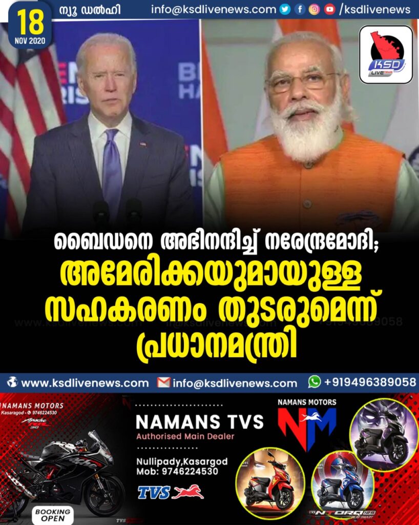 ബൈഡനെ അഭിനന്ദിച്ച് നരേന്ദ്രമോദി ; അമേരിക്കയുമായുള്ള സഹകരണം തുടരുമെന്ന് പ്രധാനമന്ത്രി