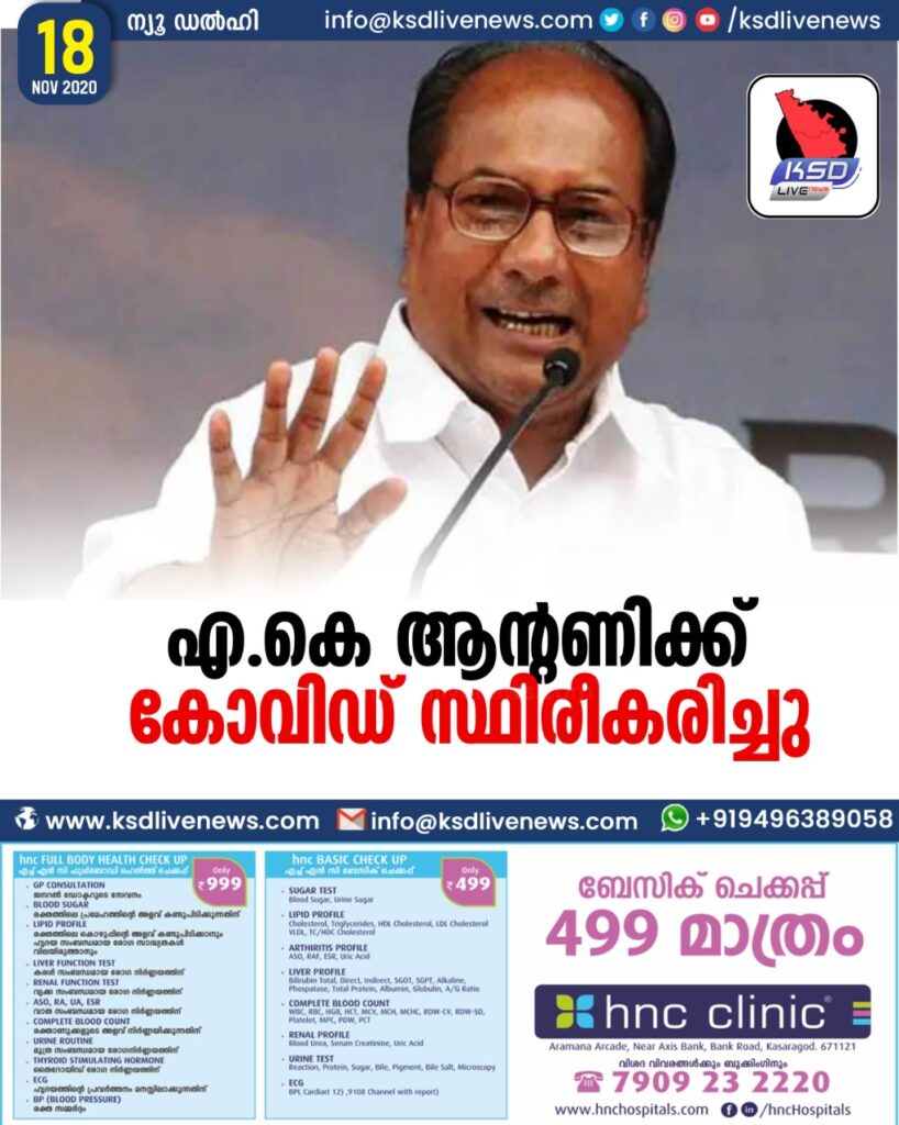 എ.കെ ആന്റണിക്ക് കോവിഡ് സ്ഥിരീകരിച്ചു