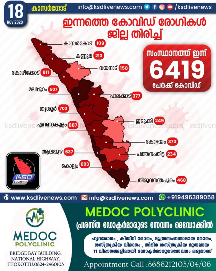 സംസ്ഥാനത്ത് ഇന്ന് 6419 പേര്ക്ക് കോവിഡ്-19 സ്ഥിരീകരിച്ചു. എറണാകുളം 887, കോഴിക്കോട് 811, തൃശൂര് 703, കൊല്ലം 693, ആലപ്പുഴ 637, മലപ്പുറം 507, തിരുവനന്തപുരം 468, പാലക്കാട് 377, കോട്ടയം 373, ഇടുക്കി 249, പത്തനംതിട്ട 234, കണ്ണൂര് 213, വയനാട് 158, കാസര്ഗോഡ് 109 എന്നിങ്ങനേയാണ് ജില്ലകളില് ഇന്ന് രോഗ ബാധ സ്ഥിരീകരിച്ചത്.