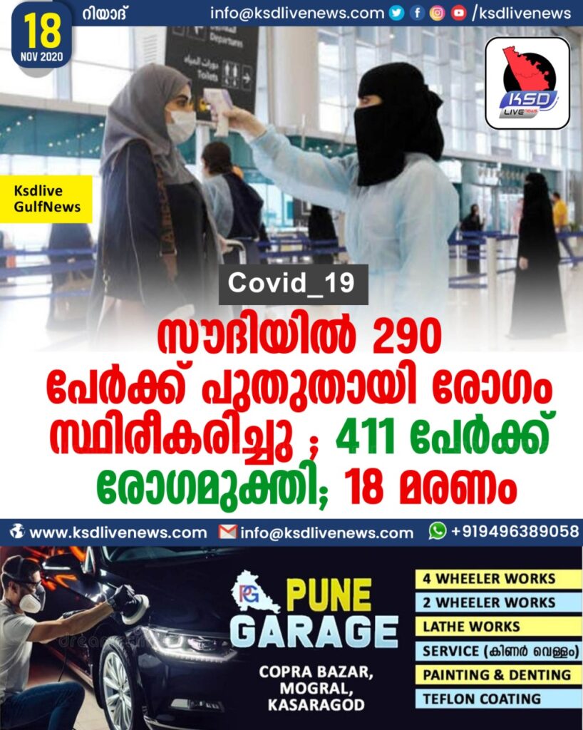 സൗദിയിൽ 290 പേര്ക്ക് പുതുതായി രോഗം സ്ഥിരീകരിച്ചു ; .411 പേര്ക്ക് രോഗമുക്തി ; 18 മരണം