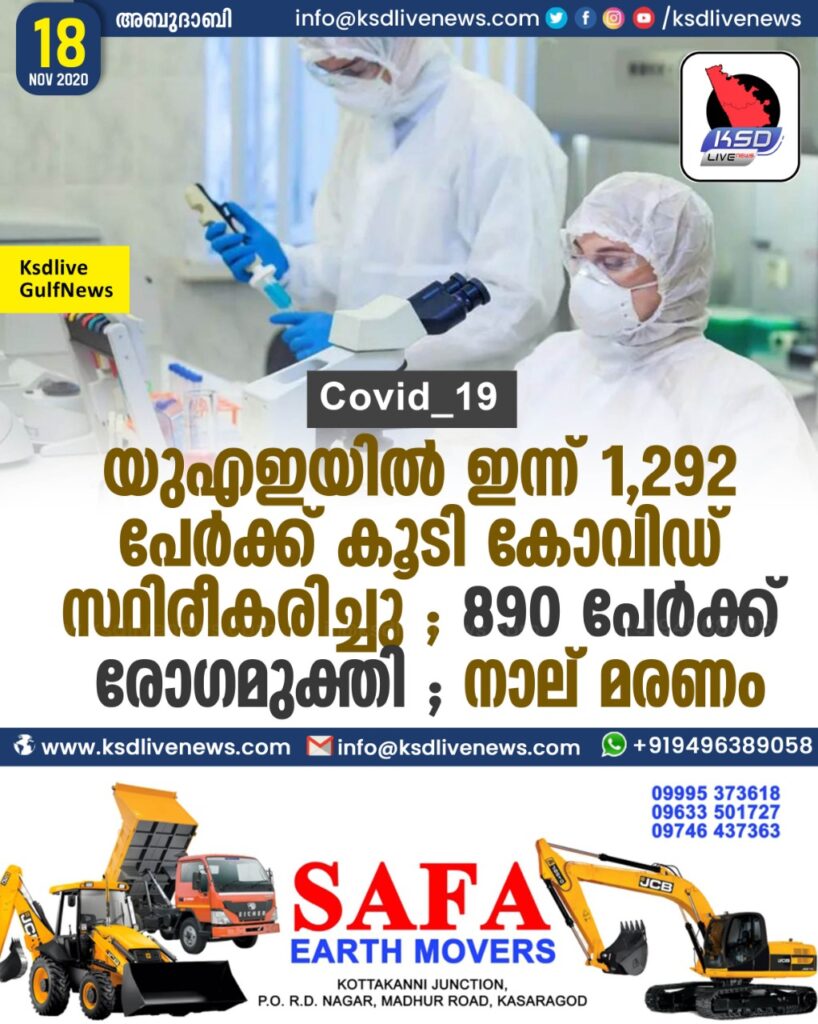 1,292 പേര്ക്ക് കൂടി കോവിഡ് സ്ഥിരീകരിച്ചു ; 890 പേര്ക്ക് രോഗമുക്തി ; നാല് മരണം