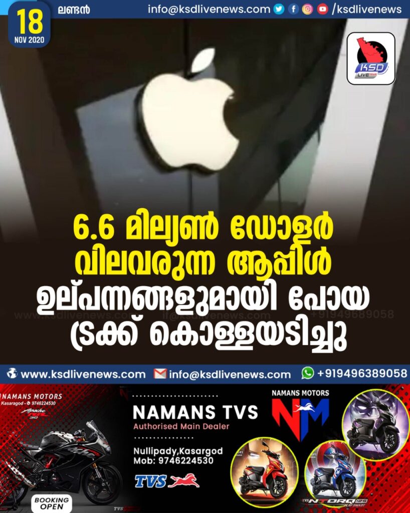 6.6 മില്യണ്‍ ഡോളര്‍ വിലവരുന്ന ആപ്പിള്‍ ഉല്പന്നങ്ങളുമായി പോയ ട്രക്ക് കൊള്ളയടിച്ചു