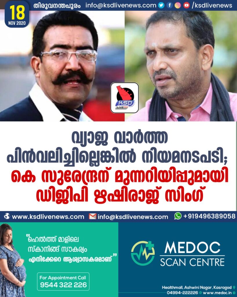 വ്യാജ വാർത്ത പിൻവലിച്ചില്ലെങ്കിൽ നിയമനടപടി ; കെ സുരേന്ദ്രന് മുന്നറിയിപ്പുമായി ഡിജിപി ഋഷിരാജ് സിംഗ്