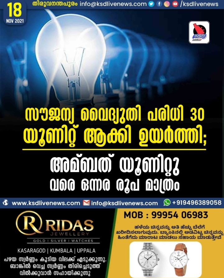 സൗജന്യ വൈദ്യുതി പരിധി 30 യൂണിറ്റ് ആക്കി ഉയര്ത്തി; അമ്ബത് യൂണിറ്റുവരെ ഒന്നര രൂപ മാത്രം