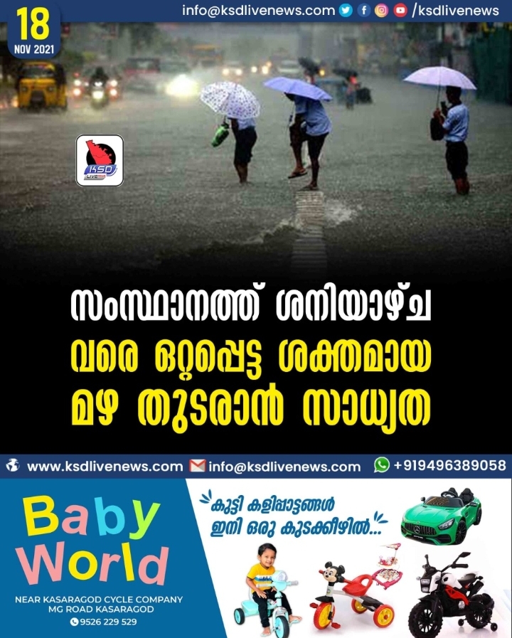 സംസ്ഥാനത്ത് ശനിയാഴ്ച വരെ ഒറ്റപ്പെട്ട ശക്തമായ മഴ തുടരാന് സാധ്യത