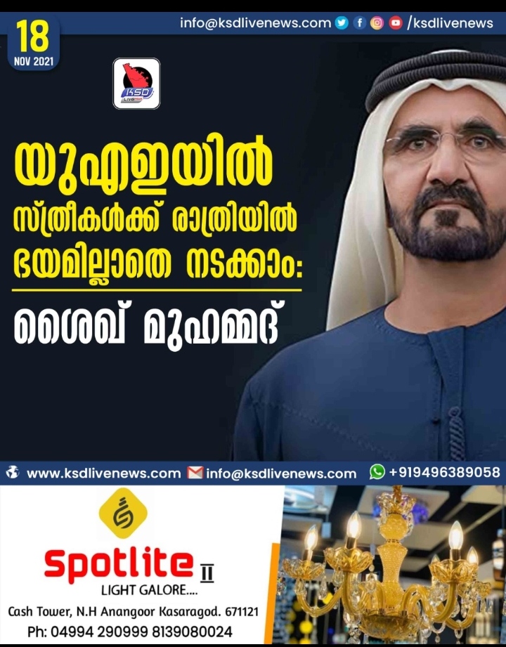 ദുബായ്: രാത്രിയില് സ്ത്രീകള്ക്ക് ഭയമില്ലാതെ നടക്കാന് കഴിയുന്ന രാജ്യമാണ് യുഎഇയെന്ന് ദുബായ് ഭരണാധികാരിയും യുഎഇ വൈസ് പ്രസിഡന്റും പ്രധാനമന്ത്രിയുമായ ശൈഖ് മുഹമ്മദ് ബിന് റാഷിദ് അല് മക്തൂം.