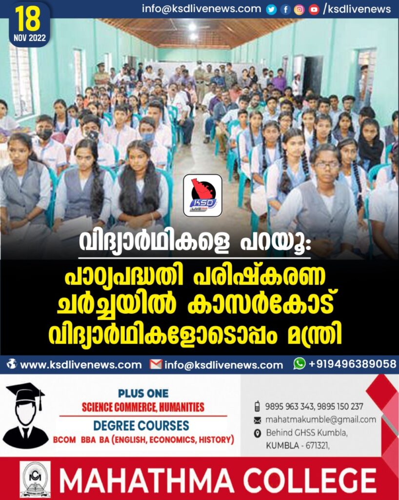 വിദ്യാർഥികളെ പറയൂ’ : പാഠ്യപദ്ധതി പരിഷ്കരണ ചർച്ചയിൽ കാസർകോട് വിദ്യാർഥികളോടൊപ്പം മന്ത്രി