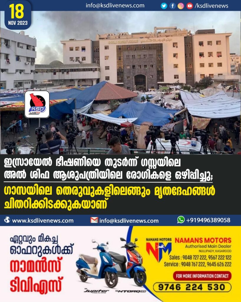 ഇസ്രായേല് ഭീഷണിയെതുടര്ന്ന് ഗസ്സയിലെ അല്ശിഫ ആശുപത്രിയിലെ രോഗികളെ ഒഴിപ്പിച്ചു; ഗാസയിലെ തെരുവുകളിലെങ്ങും മൃതദേഹങ്ങൾ ചിതറിക്കിടക്കുകയാണ്