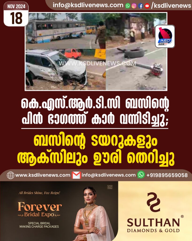 കെ.എസ്.ആര്.ടി.സി ബസിന്റെ പിന് ഭാഗത്ത് കാര് വന്നിടിച്ചു; ബസിന്റെ ടയറുകളും ആക്സിലും ഊരി തെറിച്ചു