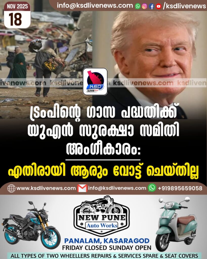 ട്രംപിന്റെ ഗാസ പദ്ധതിക്ക് യുഎന് സുരക്ഷാ സമിതി അംഗീകാരം: എതിരായി ആരും വോട്ട് ചെയ്തില്ല