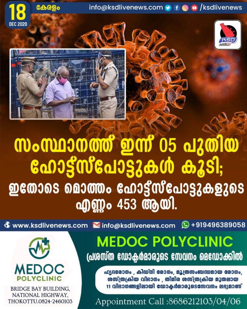 സംസ്ഥാനത്ത് ഇന്ന് 05 പുതിയ ഹോട്ട്സ്പോട്ടുകള് കൂടി; ഇതോടെ മൊത്തം ഹോട്ട്സ്പോട്ടുകളുടെ എണ്ണം 453 ആയി.