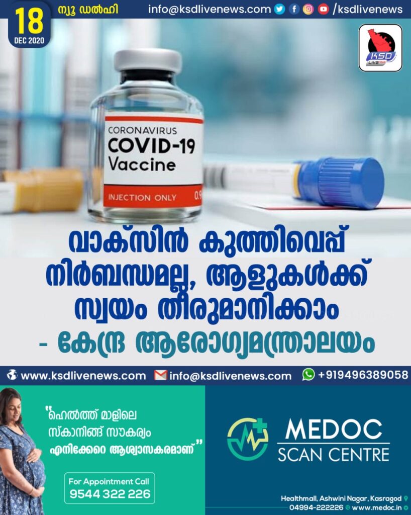 വാക്സിന് കുത്തിവെപ്പ് നിര്ബന്ധമല്ല, ആളുകള്ക്ക് സ്വയം തീരുമാനിക്കാം- കേന്ദ്ര ആരോഗ്യമന്ത്രാലയം
