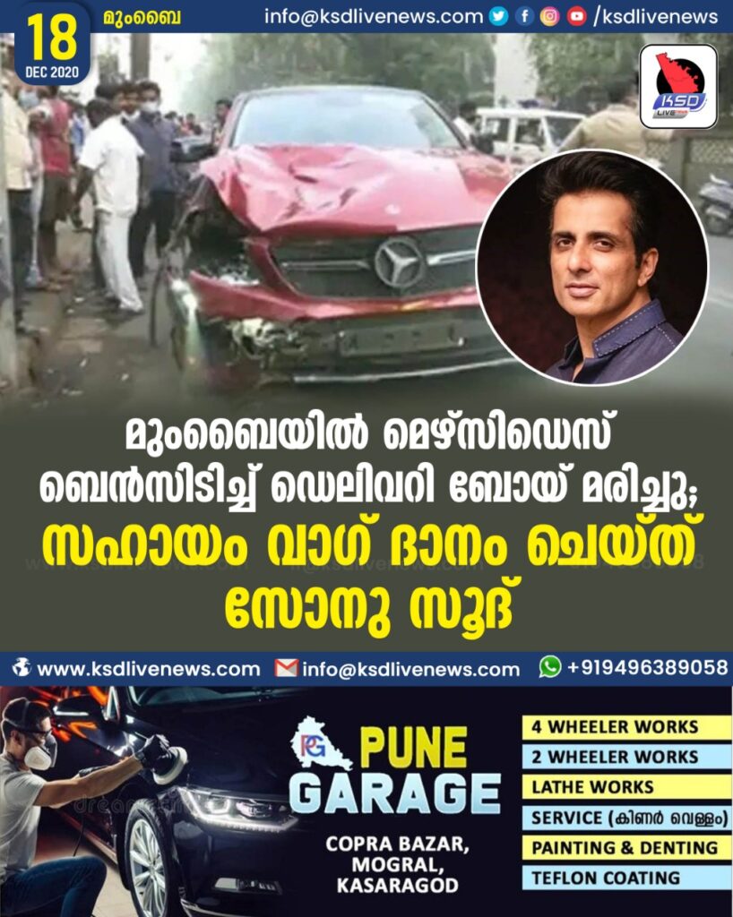 മുംബൈയിൽ മെഴ്സിഡെസ് ബെൻസിടിച്ച് ഡെലിവറി ബോയ് മരിച്ചു ; സഹായം വാഗ് ദാനം ചെയ്ത് സോനു സൂദ്