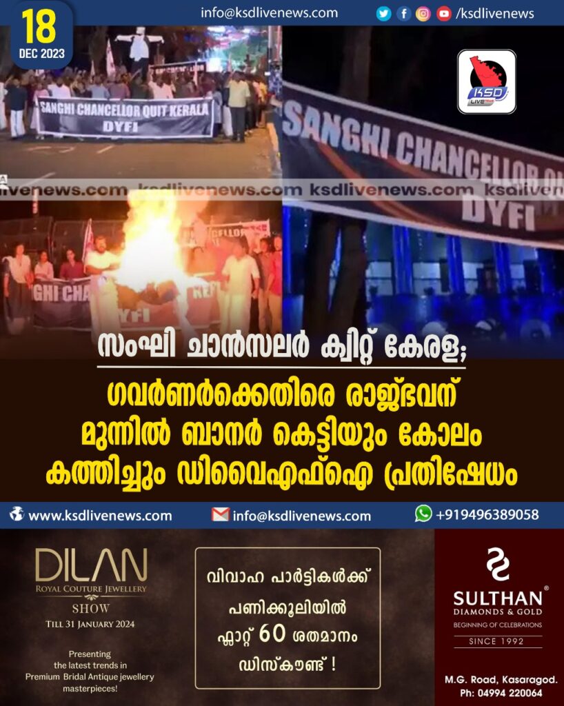 സംഘി ചാൻസലര് ക്വിറ്റ് കേരള’; ഗവര്ണര്ക്കെതിരെ രാജ്ഭവന് മുന്നില് ബാനര് കെട്ടിയും കോലം കത്തിച്ചും ഡിവൈഎഫ്ഐ പ്രതിഷേധം