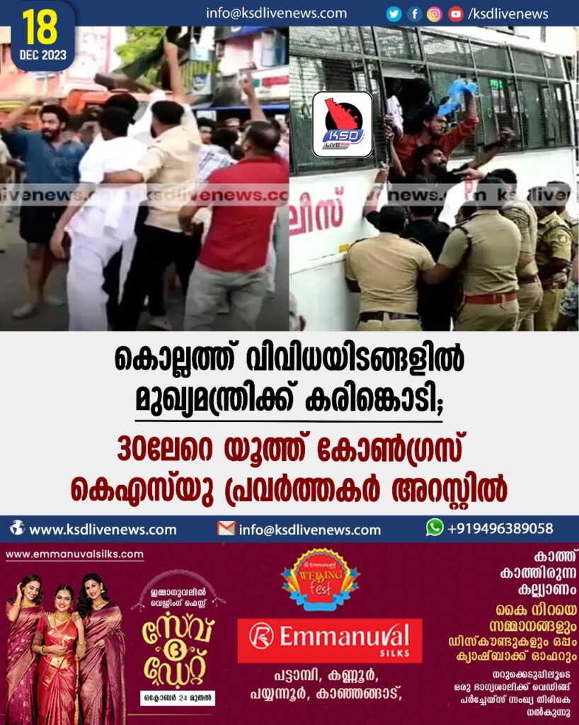 കൊല്ലത്ത് വിവിധയിടങ്ങളില്‍ മുഖ്യമന്ത്രിക്ക് കരിങ്കൊടി; 30ലേറെ യൂത്ത് കോണ്‍ഗ്രസ്- കെഎസ്‌യു പ്രവര്‍ത്തകര്‍ അറസ്റ്റില്‍