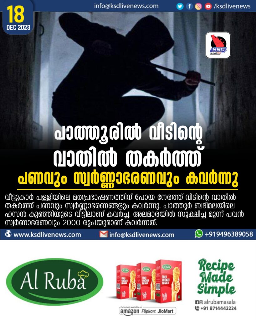 പാത്തൂരില് വീടിന്റെ വാതില് തകര്ത്ത് പണവും സ്വര്ണ്ണാഭരണവും കവര്ന്നു