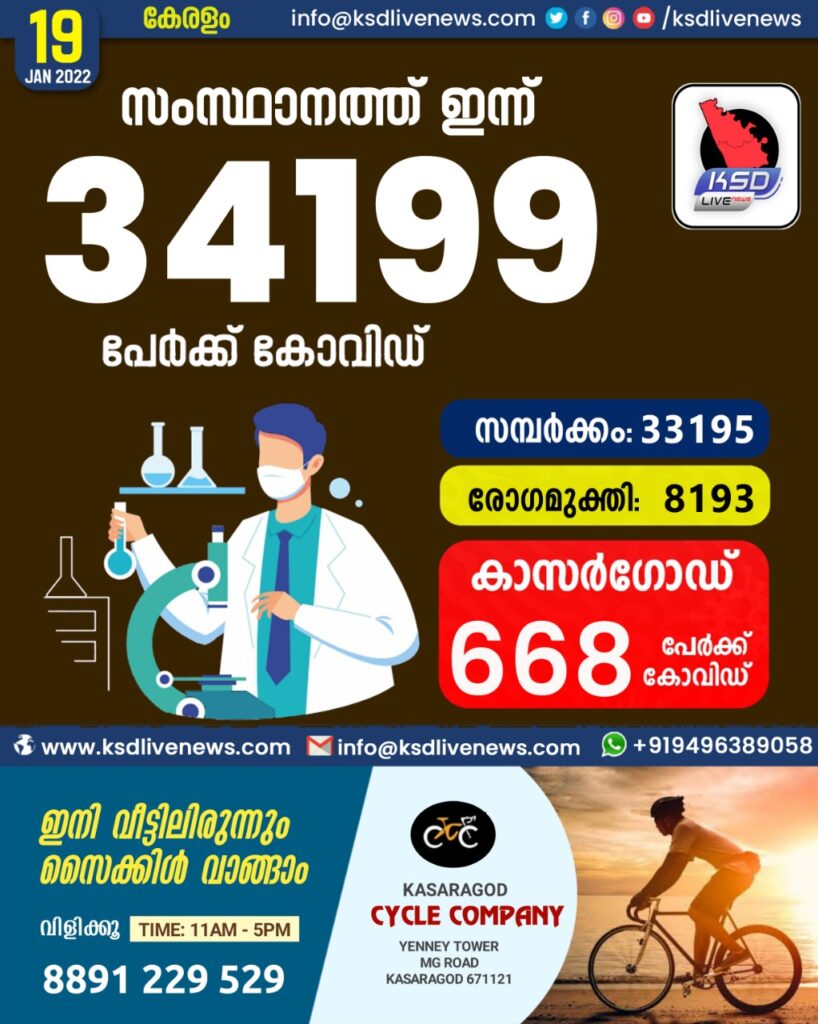 പിടിവിട്ട് കോവിഡ്; കുതിച്ചുയർന്നു കോവിഡ്; സ്ഥാനത്ത് ഇന്ന് 34199 പേർക്ക് കോവിഡ് സ്ഥിരീകരിച്ചു. സമ്പർക്കം വഴി 33195 പേർക്കും ; ആശ്വാസമായി 8193 പേർക്ക് രോഗമുക്തി ; കാസർഗോഡ് ജില്ലയിൽ 668 പേർക്ക് പുതിയ കോവിഡ് കേസുകൾ ; മരണം 49