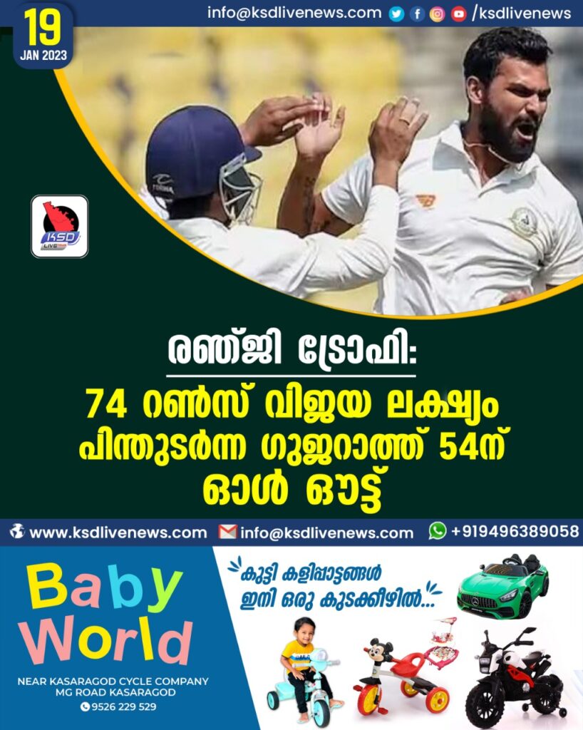 രഞ്ജി ട്രോഫി: 74 റണ്‍സ് വിജയലക്ഷ്യം പിന്തുടര്‍ന്ന ഗുജറാത്ത് 54ന് ഓള്‍ ഔട്ട്