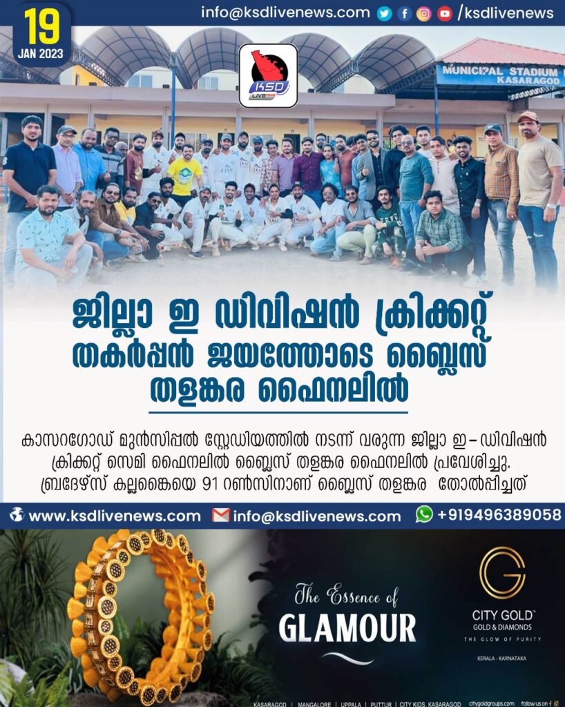 കാസറഗോഡ് മുൻസിപ്പൽ സ്റ്റേഡിയത്തിൽ നടന്ന് വരുന്ന ജില്ലാ ഇ-ഡിവിഷൻ ക്രിക്കറ്റ് സെമി ഫൈനലിൽ ബ്ലൈസ് തളങ്കര ഫൈനലിൽ പ്രവേശിച്ചു.