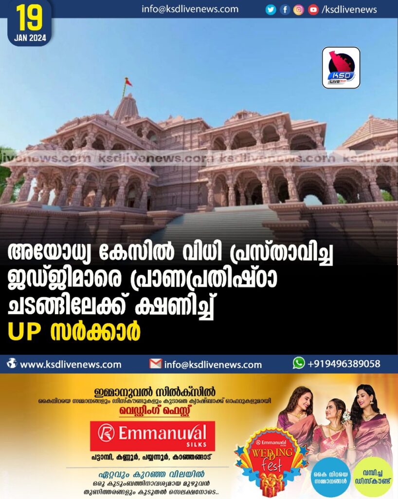 അയോധ്യ കേസില് വിധി പ്രസ്താവിച്ച ജഡ്ജിമാരെ പ്രാണപ്രതിഷ്ഠാ ചടങ്ങിലേക്ക് ക്ഷണിച്ച് UP സര്ക്കാര്