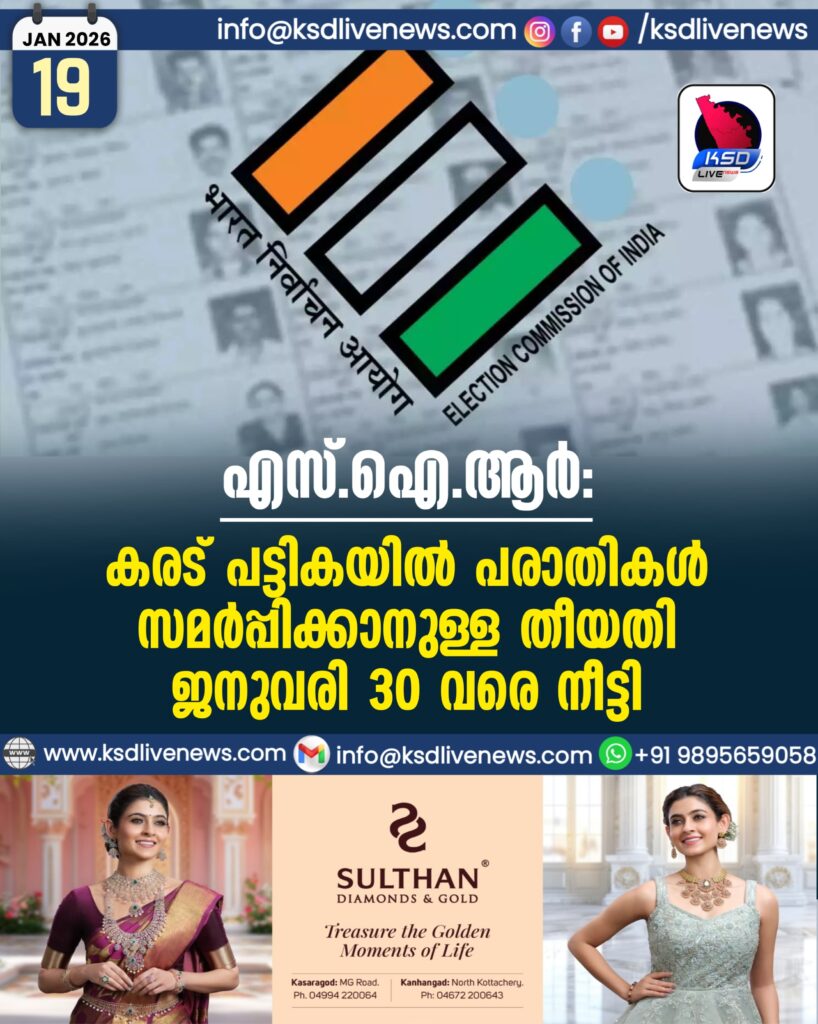 സുപ്രിംകോടതിയുടെ നിർദേശപ്രകാരമാണ് മാറ്റമെന്ന് കമ്മീഷൻ വ്യക്തമാക്കി. 2025 ഡിസംബർ 23-നാണ് കേരളത്തിൽ കരട് വോട്ടർ പട്ടിക പ്രസിദ്ധീകരിച്ചത്. ഗുജറാത്ത്, തമിഴ്നാട് സംസ്ഥാനങ്ങളിലും പരാതികൾ സമർപ്പിക്കാനുള്ള തീയതി 30 വരെ നീട്ടിയിട്ടുണ്ട്.