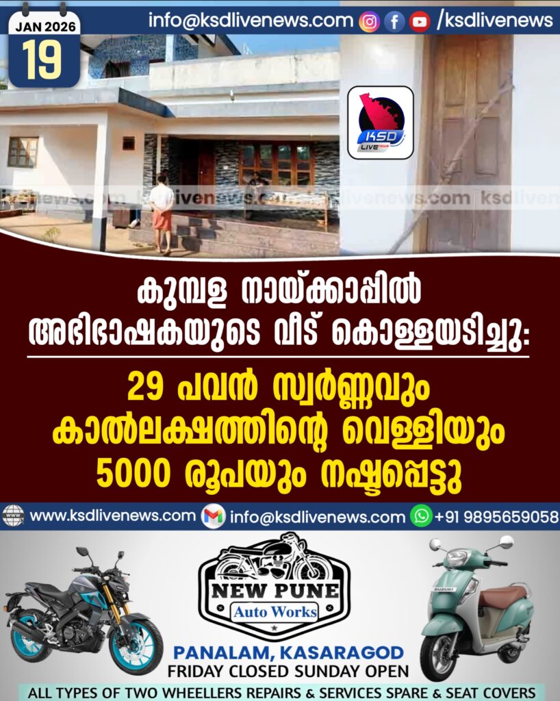 കുമ്പള നായ്ക്കാപ്പില് അഭിഭാഷകയുടെ വീട് കൊള്ളയടിച്ചു: 29 പവന് സ്വര്ണ്ണവും കാല്ലക്ഷത്തിന്റെ വെള്ളിയും 5000 രൂപയും നഷ്ടപ്പെട്ടു
