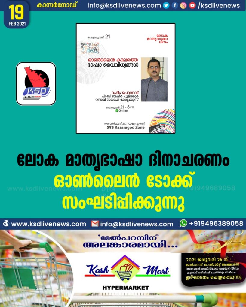 കാസർകോട്: ലോക മാതൃഭാഷാ ദിനമായ ഫെബ്രുവരി 21 ന് കാസർകോട് സോൺ എസ് വൈ എസ് സാംസ്കാരിക വിഭാഗം ഓൺലൈൻ കാലത്തെ ഭാഷാ വൈവിധ്യങ്ങൾ എന്ന വിഷയത്തിൽ ഓൺലൈൻ ടോക്ക് സംഘടിപ്പിക്കുന്നു.പരിപാടിയിൽ പ്രമുഖ സാഹിത്യകാരൻ റഹീം പൊന്നാട് , എസ് വൈ എസ് ജില്ലാ സെക്രട്ടറി ബഷീർ പുളിക്കൂർ, അബ്ദുൽ റസാഖ് സഖാഫി കോട്ടക്കുന്ന്, അഹ്മദ് സഅദി, ഇർഫാദ് മായിപ്പാടി, ലത്വീഫ് തുരുത്തി, റാഷിദ് പുളിക്കൂർ എന്നിവർ സംവദിക്കും.