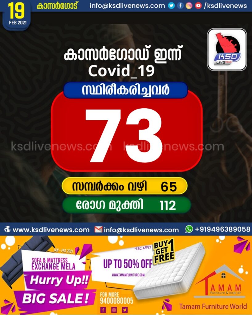 കാസർഗോഡ് ജില്ലയിൽ ഇന്ന് 72 പേർക്ക് കോവിഡ് സ്ഥിരീകരിച്ചു. സമ്പർക്കം വഴി 65 പേർക്കും. 112 പേർക്ക് രോഗമുക്തി