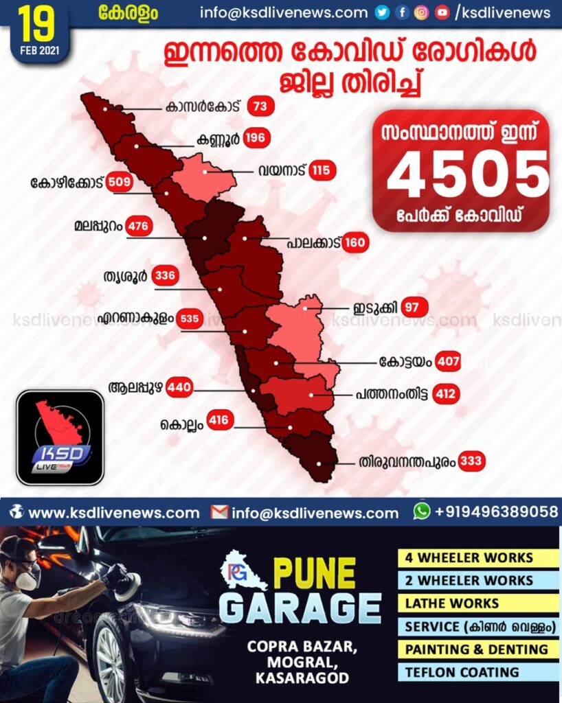 സംസ്ഥാനത്ത് ഇന്ന് 4505 പേര്ക്ക് കോവിഡ്-19 സ്ഥിരീകരിച്ചു. എറണാകുളം 535, കോഴിക്കോട് 509, മലപ്പുറം 476, ആലപ്പുഴ 440, കൊല്ലം 416, പത്തനംതിട്ട 412, കോട്ടയം 407, തൃശൂര് 336, തിരുവനന്തപുരം 333, കണ്ണൂര് 196, പാലക്കാട് 160, വയനാട് 115, ഇടുക്കി 97, കാസര്ഗോഡ് 73 എന്നിങ്ങനേയാണ് ജില്ലകളില് ഇന്ന് രോഗ ബാധ സ്ഥിരീകരിച്ചത്.