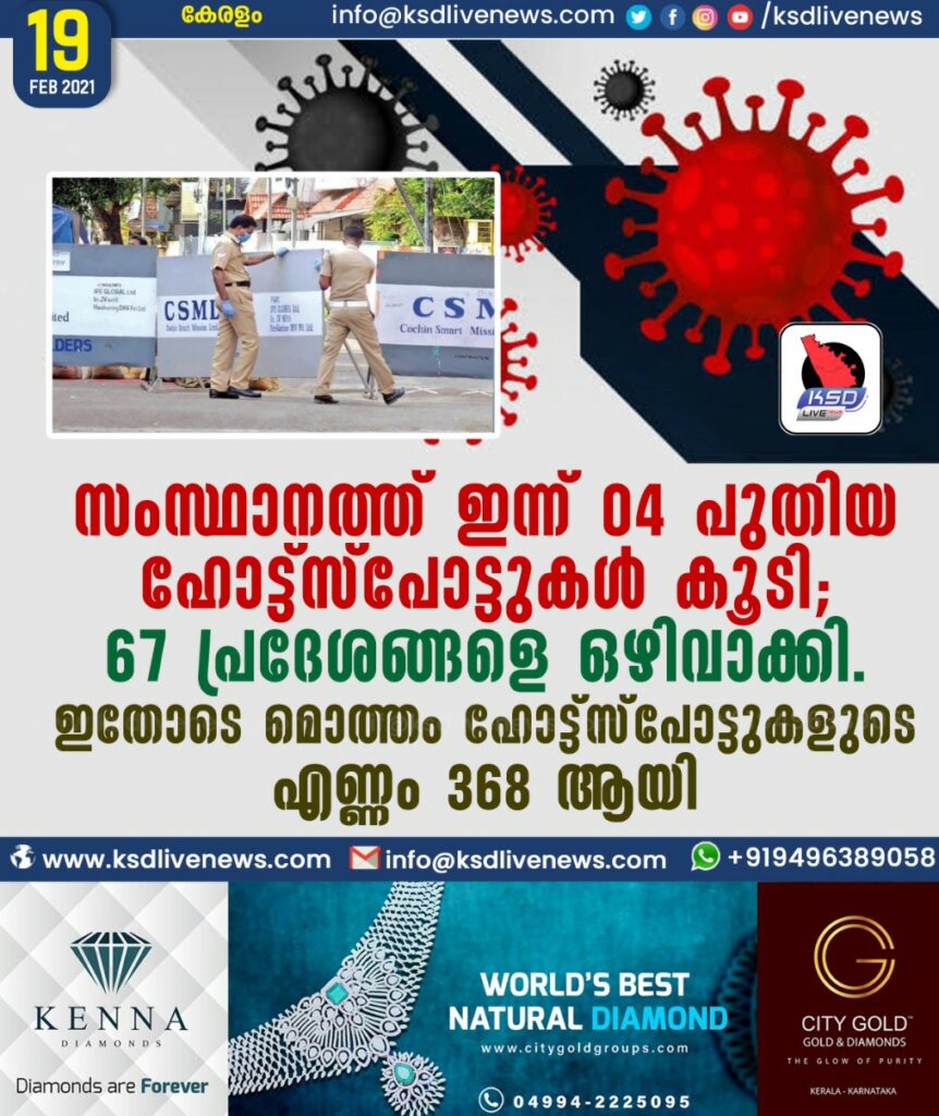 സംസ്ഥാനത്ത് ഇന്ന് 04 പുതിയ ഹോട്ട്സ്പോട്ടുകള് കൂടി; 67 പ്രദേശങ്ങളെ ഒഴിവാക്കി. ഇതോടെ മൊത്തം ഹോട്ട്സ്പോട്ടുകളുടെ എണ്ണം 368 ആയി.SHARE THIS ONഇന്ന് 4 പുതിയ ഹോട്ട് സ്പോട്ടുകളാണുള്ളത്. 67 പ്രദേശങ്ങളെ ഹോട്ട് സ്പോട്ടില് നിന്നും ഒഴിവാക്കി. നിലവില് ആകെ 368 ഹോട്ട് സ്പോട്ടുകളാണുള്ളത്.