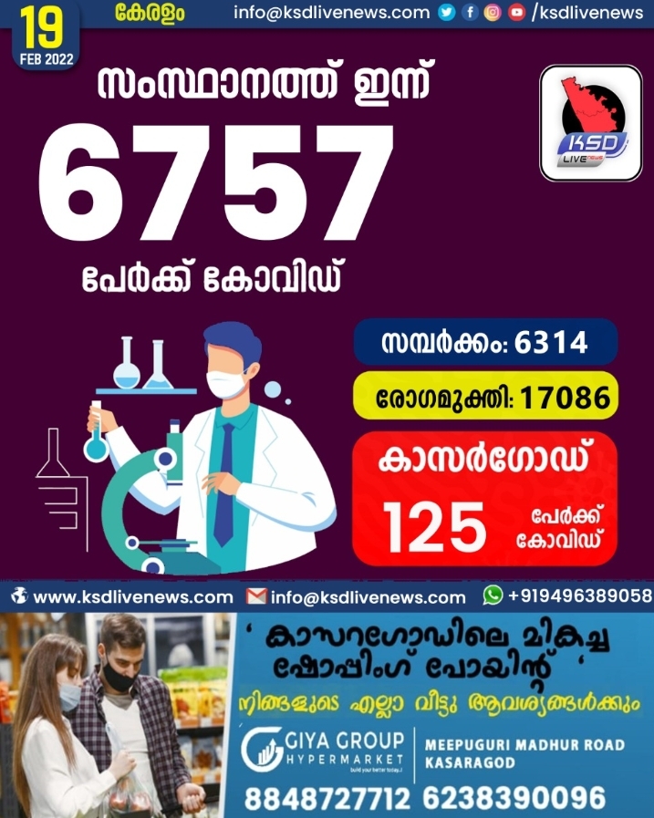 സംസ്ഥാനത്ത് ഇന്ന് 6757 കോവിഡ് സ്ഥിരീകരിച്ചു. സമ്പർക്കം വഴി 6314 പേർക്കും ; ആശ്വാസമായി 17086 പേർക്ക് രോഗമുക്തി ; കാസർഗോഡ് ജില്ലയിൽ 125 പേർക്ക് പുതിയ കോവിഡ് കേസുകൾ ; മരണം 16