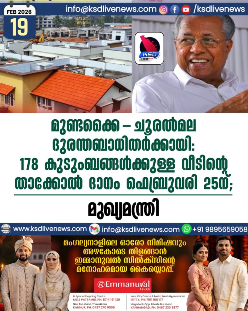 മുണ്ടക്കൈ-ചൂരൽമല ദുരന്തബാധിതർക്കായി: 178 കുടുംബങ്ങൾക്കുള്ള വീടിന്റെ താക്കോൽ ദാനം ഫെബ്രുവരി 25ന്; മുഖ്യമന്ത്രി
