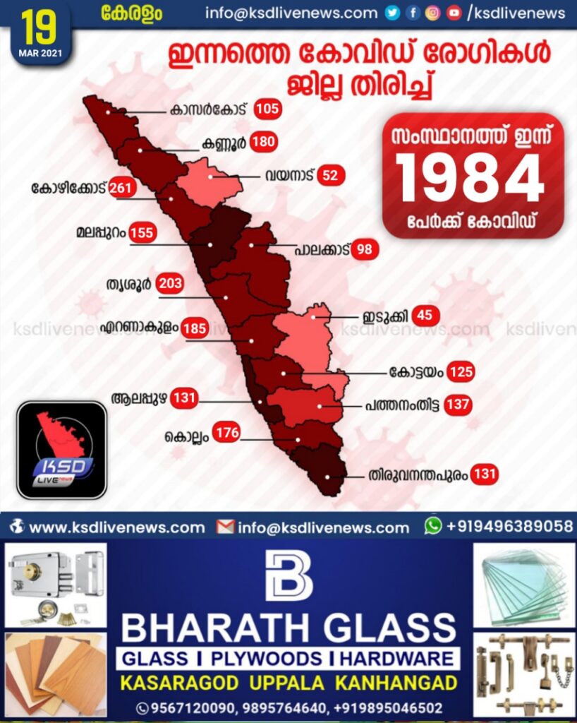 കേരളത്തില് ഇന്ന് 1984 പേര്ക്ക് കോവിഡ്-19 സ്ഥിരീകരിച്ചു. കോഴിക്കോട് 261, തൃശൂര് 203, എറണാകുളം 185, കണ്ണൂര് 180, കൊല്ലം 176, മലപ്പുറം 155, പത്തനംതിട്ട 137, ആലപ്പുഴ 131, തിരുവനന്തപുരം 131, കോട്ടയം 125, കാസര്ഗോഡ് 105, പാലക്കാട് 98, വയനാട് 52, ഇടുക്കി 45 എന്നിങ്ങനേയാണ് ജില്ലകളില് ഇന്ന് രോഗ ബാധ സ്ഥിരീകരിച്ചത്.