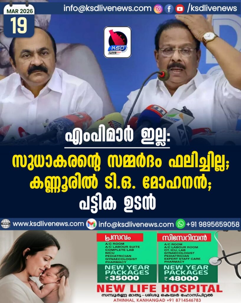 എംപിമാർ ഇല്ല: സുധാകരന്റെ സമ്മർദം ഫലിച്ചില്ല; കണ്ണൂരിൽ ടി.ഒ.മോഹനൻ; പട്ടിക ഉടൻ