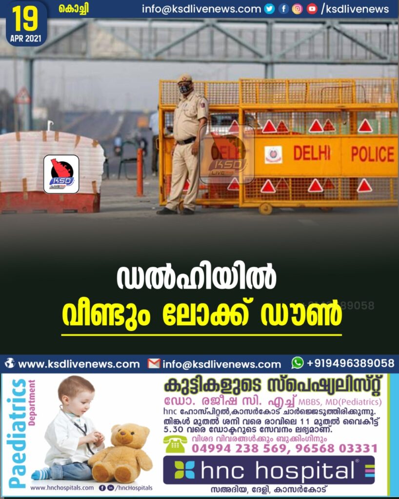 ഡല്‍ഹിയില്‍ ആറ് ദിവസത്തേക്ക് ലോക്ക് ഡൗണ്‍ പ്രഖ്യാപിച്ചു. ഇന്ന് രാത്രി പത്ത് മണിക്ക് ലോക്ക് ഡൗണ്‍ പ്രാബല്യത്തില്‍ വരുമെന്ന് മുഖ്യമന്ത്രി അരവിന്ദ് കേജ്‌രിവാള്‍ വ്യക്തമാക്കി. അവശ്യ സര്‍വീസുകള്‍ക്ക് നിയന്ത്രണങ്ങളില്‍ ഇളവ് അനുവദിച്ചിട്ടുണ്ട്.