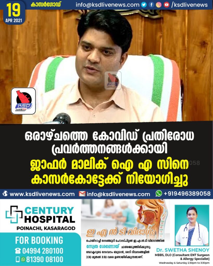 ഒരാഴ്ചത്തെ കോവിഡ് പ്രതിരോധ പ്രവർത്തനങ്ങൾക്കായി ജാഫർ മാലിക് ഐ എ സിനെ കാസർകോട്ടേക്ക് നിയോഗിച്ചു