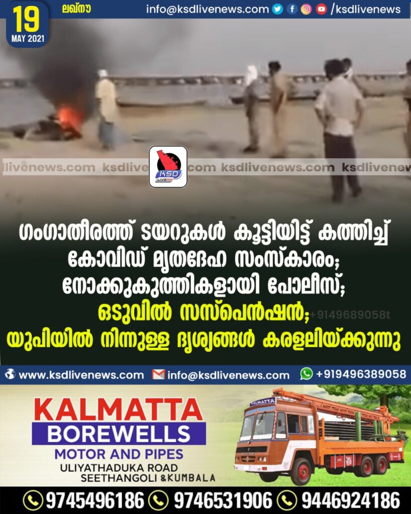 ഗംഗാതീരത്ത് ടയറുകള് കൂട്ടിയിട്ട് കത്തിച്ച് കോവിഡ് മൃതദേഹ സംസ്കാരം; നോക്കുകുത്തികളായി പോലീസ്; ഒടുവിൽ സസ്പെൻഷൻ ; യുപിയില് നിന്നുള്ള ദൃശ്യങ്ങള് കരളലിയ്ക്കുന്നു