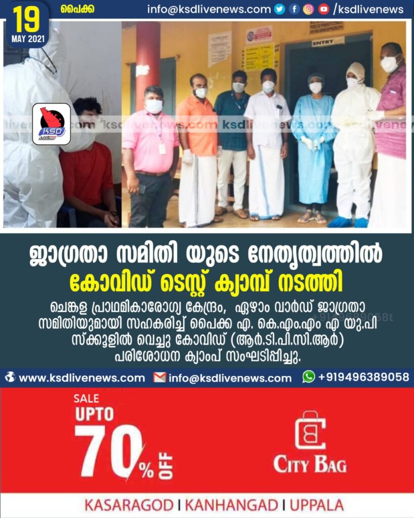 പൈക്ക: ചെങ്കള പ്രാഥമികാരോഗ്യ കേന്ദ്രം, ഏഴാം വാർഡ് ജാഗ്രതാ സമിതിയുമായി സഹകരിച്ച് പൈക്ക എ. കെ.എം.എം എ യു.പി സ്ക്കൂളിൽ വെച്ചു കോവിഡ് (ആർ.ടി.പി.സി.ആർ)പരിശോധന ക്യാംപ് സംഘടിപ്പിച്ചു.