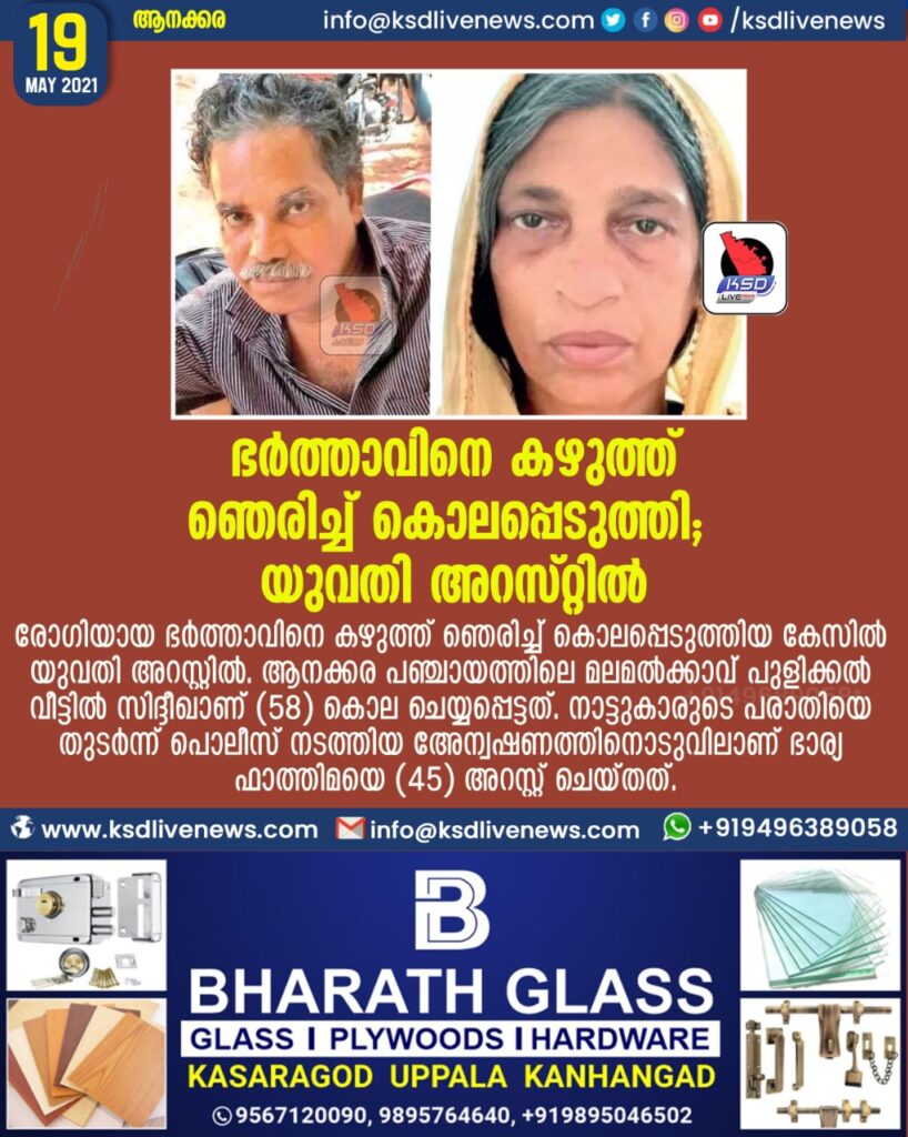 ആ​ന​ക്ക​ര: മാ​ന​സി​ക രോ​ഗി​യാ​യ ഭ​ര്‍ത്താ​വി​നെ ക​ഴു​ത്ത് ഞെ​രി​ച്ച്​ കൊ​ല​പ്പെ​ടു​ത്തി​യ കേ​സി​ൽ യു​വ​തി അ​റ​സ്​​റ്റി​ൽ. ആ​ന​ക്ക​ര പ​ഞ്ചാ​യ​ത്തി​ലെ മ​ല​മ​ല്‍ക്കാ​വ് പു​ളി​ക്ക​ല്‍ വീ​ട്ടി​ല്‍ സി​ദ്ദീ​ഖാ​ണ്​ (58) കൊ​ല ചെ​യ്യ​പ്പെ​ട്ട​ത്. നാ​ട്ടു​കാ​രു​ടെ പ​രാ​തി​യെ തു​ട​ർ​ന്ന്​ പൊ​ലീ​സ്​ ന​ട​ത്തി​യ അ​േ​ന്വ​ഷ​ണ​ത്തി​നൊ​ടു​വി​ലാ​ണ്​ ഭാ​ര്യ ഫാ​ത്തി​മ​യെ (45) അ​റ​സ്​​റ്റ്​ ചെ​യ്​​ത​ത്. തി​ങ്ക​ളാ​ഴ്ച രാ​വി​ലെ സി​ദ്ദീ​ഖ് മ​രി​ച്ച​താ​യി വീ​ട്ടു​കാ​രാ​ണ്​ നാ​ട്ടു​കാ​രെ വി​വ​ര​മ​റി​യി​ച്ച​ത്. തു​ട​ര്‍ന്ന് ബ​ന്ധു​ക്ക​ള്‍ ഖ​ബ​റ​ട​ക്ക​ത്തി​ന് ഒ​രു​ക്കം ന​ട​ത്തു​ന്ന​തി​നി​ടെ സി​ദ്ദീ​ഖി​െൻറ ശ​രീ​ര​ത്തി​ല്‍ ക​ണ്ട മു​റി​പ്പാ​ടു​ക​ള്‍ നാ​ട്ടു​കാ​രു​ടെ സം​ശ​യ​ത്തി​നി​ട​യാ​ക്കി. തു​ട​ര്‍ന്ന് തൃ​ത്താ​ല പൊ​ലീ​സി​ല്‍ വി​വ​രം കൈ​മാ​റു​ക​യും ഖ​ബ​റ​ട​ക്കം നി​ര്‍ത്തി​വെ​ക്കാ​ന്‍ പൊ​ലീ​സ് ആ​വ​ശ്യ​പ്പെ​ടു​ക​യും ചെ​യ്തു. മൃ​ത​ദേ​ഹം പ​രി​ശോ​ധി​ച്ച പൊ​ലീ​സി​നും സം​ശ​യം തോ​ന്നി​യ​തോ​ടെ പാ​ല​ക്കാ​ട് ജി​ല്ല ആ​ശു​പ​ത്രി​യി​ൽ പോ​സ്​​റ്റ്​​മോ​ര്‍ട്ടം ന​ട​ത്തി. പോ​സ്​​റ്റ്​​മോ​ര്‍ട്ടം പ്രാ​ഥ​മി​ക റി​പ്പോ​ര്‍ട്ടി​ല്‍ ക​ഴു​ത്തി​ല്‍ തു​ണി​പോ​ലു​ള്ള വ​സ്തു ഉ​പ​യോ​ഗി​ച്ച് മു​റു​ക്കി​യ​താ​ണ് മ​ര​ണ​കാ​ര​ണ​മെ​ന്ന്​ ക​ണ്ടെ​ത്തി​യി​രു​ന്നു. വൈ​കീ​ട്ടോ​ടെ മൃ​ത​ദേ​ഹം കൂ​ട​ല്ലൂ​ര്‍ ജു​മാ​മ​സ്ജി​ദ് ഖ​ബ​ർ​സ്ഥാ​നി​ല്‍ ഖ​ബ​റ​ട​ക്കി. രാ​ത്രി​യോ​ടെ ഷൊ​ര്‍ണൂ​ര്‍ ഡി​വൈ.​എ​സ്.​പി സി. ​ഹ​രി​ദാ​സ്, തൃ​ത്താ​ല സി.​ഐ സി.​കെ. നാ​സ​ര്‍ എ​ന്നി​വ​രു​ടെ നേ​തൃ​ത്വ​ത്തി​ല്‍ ന​ട​ന്ന ചോ​ദ്യം ചെ​യ്യ​ലി​ലാ​ണ് ഫാ​ത്തി​മ കു​റ്റം സ​മ്മ​തി​ച്ച​ത്. പ്ര​തി​യെ പി.​പി.​ഇ കി​റ്റ് ധ​രി​പ്പി​ച്ച് മ​ല​മ​ല്‍ക്കാ​വി​ലെ വീ​ട്ടി​ല്‍ തെ​ളി​വെ​ടു​പ്പ് ന​ട​ത്തി. സം​ഭ​വ​ത്തെ​ക്കു​റി​ച്ച് പ്ര​തി പ​റ​യു​ന്ന​തി​ങ്ങ​നെ: മാ​ന​സി​ക രോ​ഗ​മു​ള്ള ഭ​ര്‍ത്താ​വി​നെ ഞാ​യ​റാ​ഴ്ച രാ​ത്രി പ​ല​വ​ട്ടം വീ​ടി​െൻറ മു​ൻ​ഭാ​ഗ​ത്ത് കി​ട​ത്താ​ന്‍ നോ​ക്കി. കി​ട​ത്തി​യ​പ്പോ​ഴെ​ല്ലാം മു​ൻ​ഭാ​ഗ​ത്തെ തി​ണ്ടി​ല്‍ ക​യ​റി നി​ന്നു. പി​ന്നീ​ട് അ​വി​ടെ​നി​ന്ന് താ​ഴേ​ക്ക്​ ത​ള്ളി​യി​ട്ട ശേ​ഷം കൈ​കൊ​ണ്ട് മു​ഖം പൊ​ത്തി പു​ത​പ്പ് ഉ​പ​യോ​ഗി​ച്ച് ക​ഴു​ത്ത്​ ഞെ​രി​ച്ച്​​ കൊ​ല​പ്പെ​ടു​ത്തി. തി​ങ്ക​ളാ​ഴ്ച പു​ല​ര്‍ച്ച​യോ​ടെ കൃ​ത്യം ന​ട​ത്തി​യ ശേ​ഷം മു​ൻ​വ​ശ​ത്തെ വാ​തി​ല്‍ അ​ട​ച്ച് കി​ട​ന്നു​റ​ങ്ങി. പി​ന്നീ​ട് രാ​വി​ലെ ആ​റോ​ടെ പി​താ​വി​ന് അ​ന​ക്ക​മി​െ​ല്ല​ന്ന് അ​ക​ത്ത് കി​ട​ന്നു​റ​ങ്ങു​ന്ന മ​ക​ളെ അ​റി​യി​ച്ചു. മ​ക​ളും ഭ​ര്‍ത്താ​വും കു