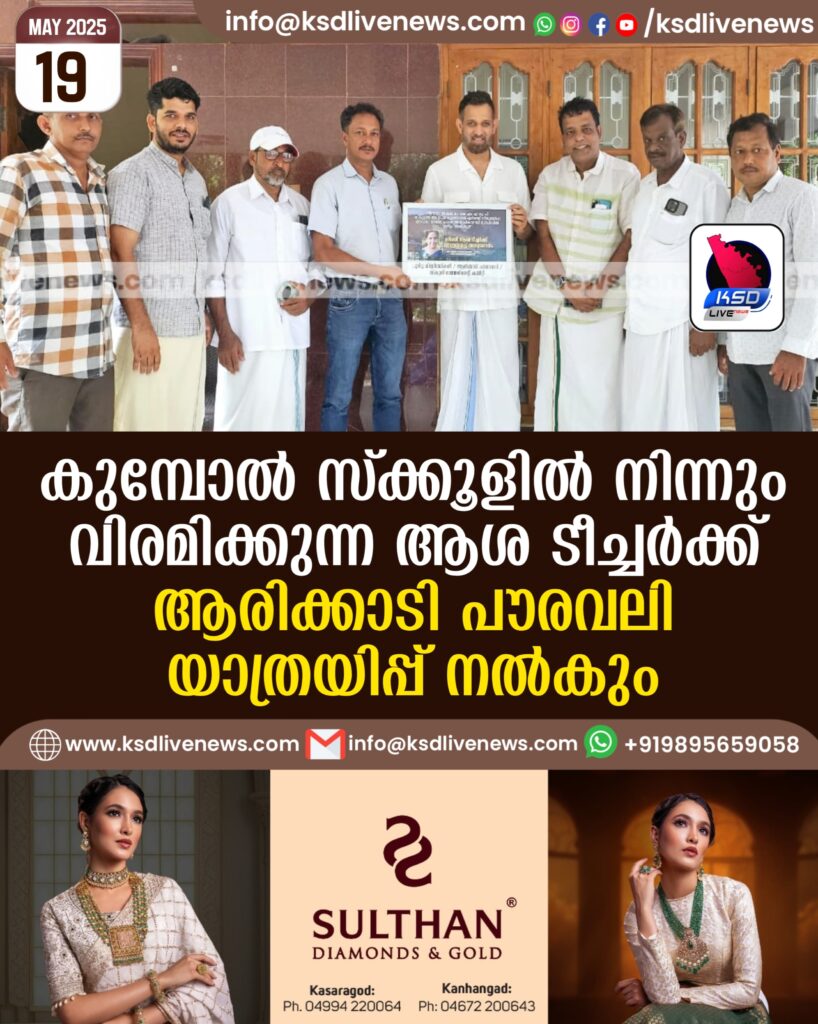 കുമ്പോൽ സ്ക്കൂളിൽ നിന്നും വിരമിക്കുന്ന ആശ ടീച്ചർക്ക് ആരിക്കാടി പൗരവലി യാത്ര യിപ്പ് നൽകും