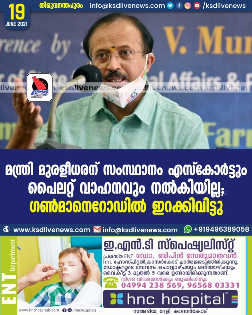 മന്ത്രി മുരളീധരന് സംസ്ഥാനം എസ്കോര്ട്ടും പൈലറ്റ് വാഹനവും നല്കിയില്ല; ഗണ്മാനെ റോഡില് ഇറക്കിവിട്ടു