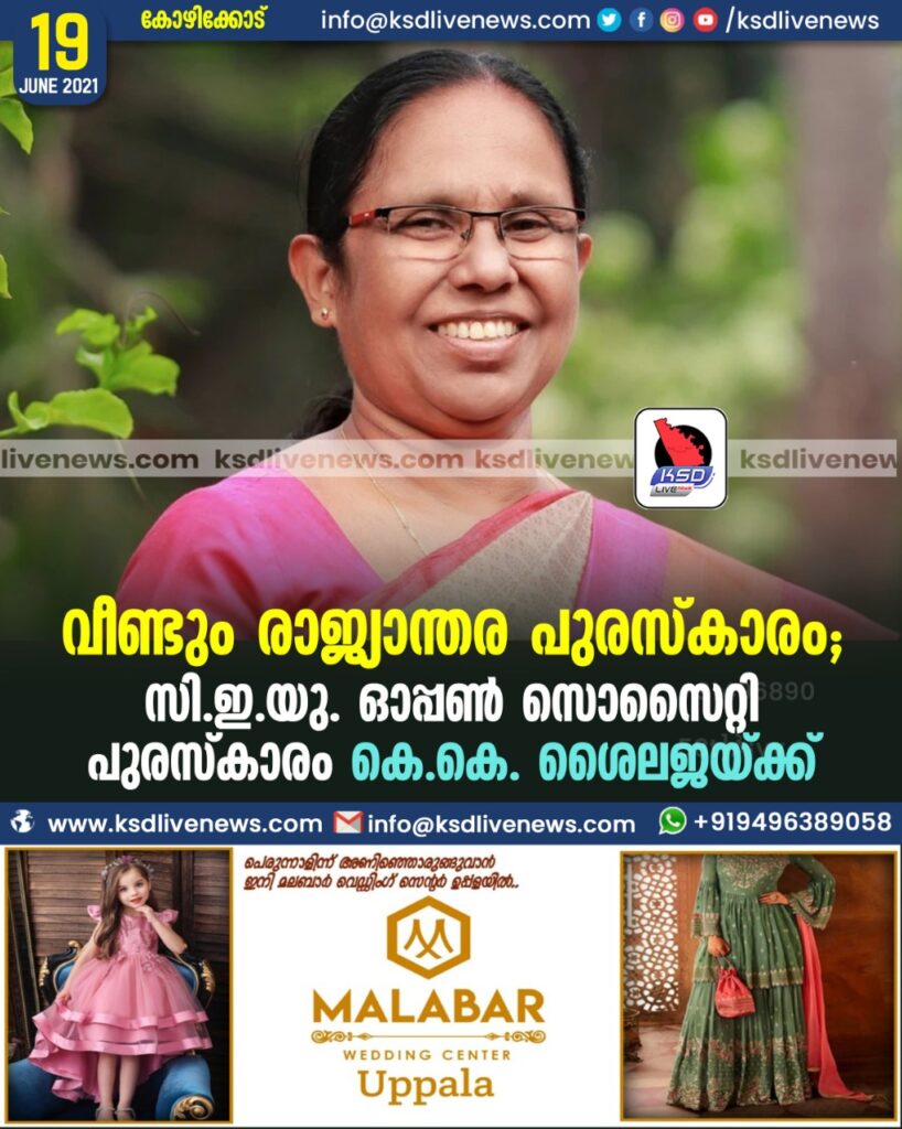 വീണ്ടും രാജ്യാന്തര പുരസ്കാരം; സി.ഇ.യു. ഓപ്പണ് സൊസൈറ്റി പുരസ്കാരം കെ.കെ. ശൈലജയ്ക്ക്
