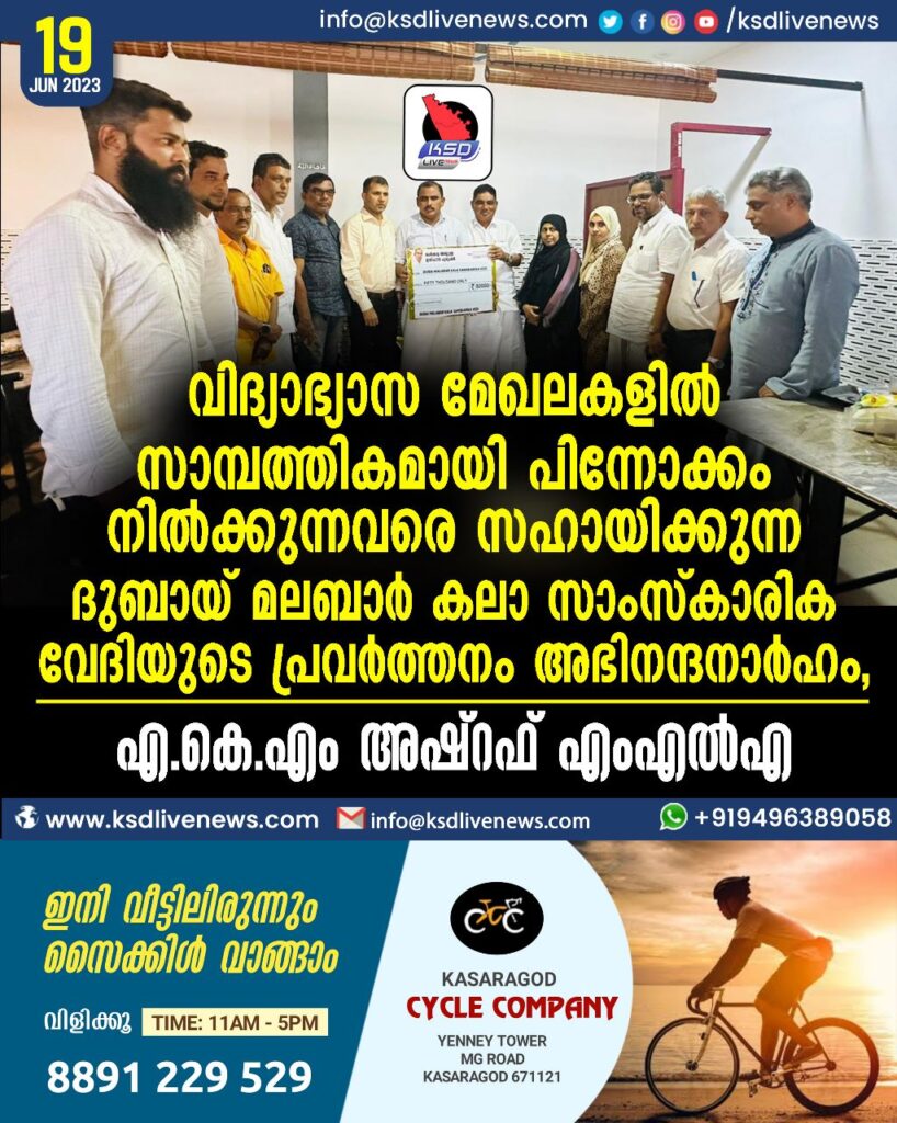 വിദ്യാഭ്യാസ മേഖലകളിൽ സാമ്പത്തികമായി പിന്നോക്കം നിൽക്കുന്നവരെ സഹായിക്കുന്ന ദുബായ് മലബാർ കലാ സാംസ്‌കാരിക വേദിയുടെ പ്രവർത്തനം അഭിനന്ദനാർഹം, എ കെ എം അഷ്‌റഫ്‌ എംഎൽഎ
