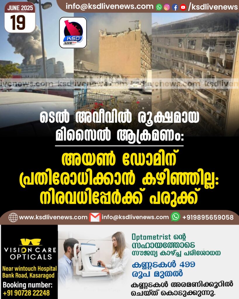 ഇസ്രയേൽ തലസ്ഥാനമായ ടെൽ അവീവിൽ ഇറാന്റെ അതിരൂക്ഷ മിസൈൽ ആക്രമണം. അഞ്ചോളം സ്ഥലങ്ങളിൽ മിസൈൽ പതിച്ചു. ഇസ്രയേലിലെ സൊറോക്ക മെഡിക്കൽ സെന്ററിന് നേരെയും ആക്രമണം ഉണ്ടായി. അയൺ ഡോമിന് മിസൈലുകളെ പ്രതിരോധിക്കാൻ കഴിഞ്ഞില്ല. ബഹുനില കെട്ടിടങ്ങളിലാണ് മിസൈൽ പതിച്ചത് . ഇസ്രയേലിലെ സൊറോക്ക മെഡിക്കൽ സെന്ററിന് നേരെയും ആക്രമണം ഉണ്ടായി. നിരവധിപ്പേർക്ക് പരുക്കേറ്റു.
