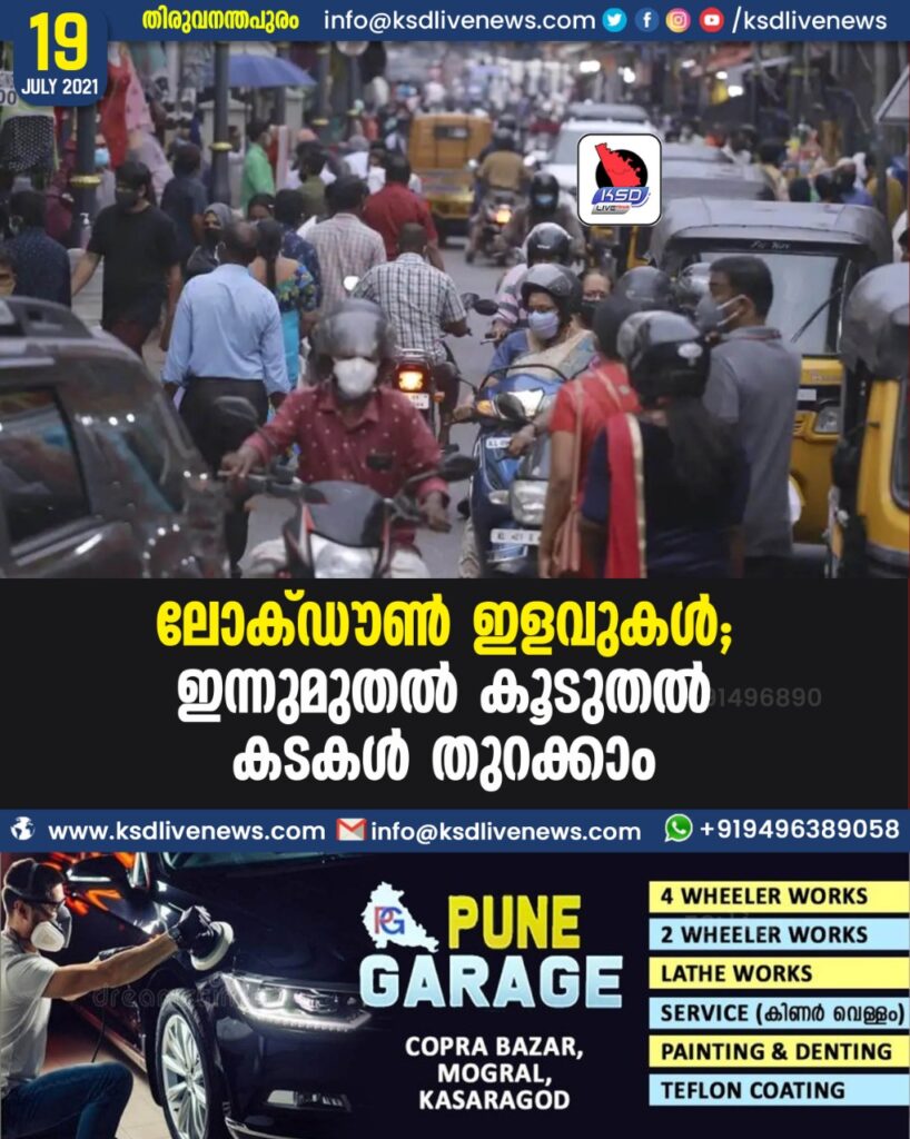 തിരുവനന്തപുരം:ലോക്ഡൗണിൽ കൂടുതൽ ഇളവുകൾ നിലവിൽവന്നതോടെ തിങ്കളാഴ്ചമുതൽ കൂടുതൽ കടകൾ തുറക്കാം. അവശ്യസാധനങ്ങൾ വിൽക്കുന്ന കടകൾക്കു പുറമേ ഇലക്ട്രോണിക്സ് ഉത്പന്നങ്ങൾ വിൽക്കുന്ന കടകൾ, ഇലക്ട്രോണിക് റിപ്പയർ ഷോപ്പുകൾ, വീട്ടുപകരണങ്ങൾ വിൽക്കുന്ന കടകൾ, ബാർബർ ഷോപ്പുകളും ബ്യൂട്ടിപാർലറുകളും തുടങ്ങിയവയ്ക്കാണ് തിങ്കളാഴ്ചമുതൽ തുറക്കാൻ അനുമതിയുള്ളത്. തുണിക്കട, ചെരിപ്പുകട, ഫാൻസിക്കട, സ്വർണക്കട തുടങ്ങിയവയ്ക്ക് ഞായർ, തിങ്കൾ, ചൊവ്വ ദിവസങ്ങളിൽ തുറക്കാൻ നേരത്തെ അനുമതി നൽകിയിരുന്നു. രോഗസ്ഥിരീകരണനിരക്ക് 10 ശതമാനം വരെയുള്ള എ, ബി. കാറ്റഗറി മേഖലകളിലാണ് തിങ്കൾമുതൽ വെള്ളി വരെ രാവിലെ ഏഴുമുതൽ രാത്രി എട്ടുവരെ കടകൾ തുറക്കാൻ അനുവദിക്കുക. ബക്രീദ് പ്രമാണിച്ച്, ട്രിപ്പിൾ ലോക്ഡൗൺ മേഖലയിലുള്ള (ഡി) പ്രദേശങ്ങളിൽ തിങ്കളാഴ്ച നിയന്ത്രണങ്ങൾക്കു വിധേയമായി കടകൾ തുറക്കാം. അവശ്യസാധനങ്ങൾ വിൽക്കുന്ന കടകൾ കൂടാതെ തുണിക്കട, ചെരുപ്പുകട, ഇലക്ട്രോണിക്സ് കടകൾ, ഫാൻസി ഷോപ്പുകൾ, സ്വർണക്കട എന്നിവ തുറക്കാനാകും. മുഖ്യമന്ത്രിയുടെ സാന്നിധ്യത്തിൽ തിങ്കളാഴ്ചയും കോവിഡ് അവലോകനയോഗമുണ്ട്. കൂടുതൽ ഇളവുകൾ വരുമെന്നാണു പ്രതീക്ഷ.