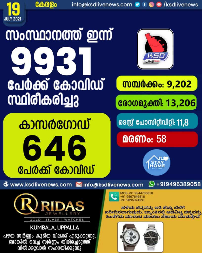 സംസ്ഥാനത്ത് ഇന്ന് 9931 പേർക്ക് കോവിഡ് സ്ഥിരീകരിച്ചു. സമ്പർക്കം വഴി 9202 പേർക്കും ; ആശ്വാസമായി 13206 പേർക്ക് രോഗ മുക്തിയും ; കാസർഗോഡ് ജില്ലയിൽ 646 പേർക്ക് പുതിയ കോവിഡ് കേസുകൾ ; മരണം 58
