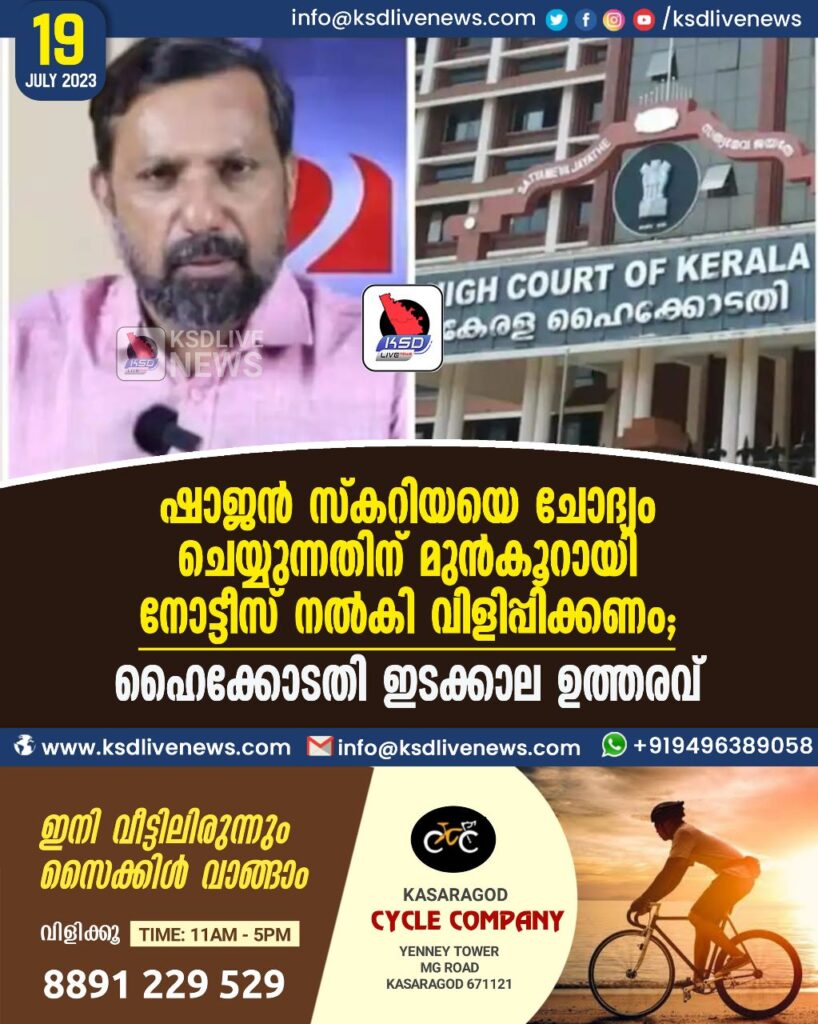 ഷാജൻ സ്കറിയയെ ചോദ്യം ചെയ്യുന്നതിന് മുൻകൂറായി നോട്ടീസ് നൽകി വിളിപ്പിക്കണം; ഹൈക്കോടതി ഇടക്കാല ഉത്തരവ്